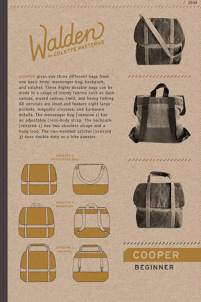 The line also has a pattern for three vintage-style satchel/backpack-type bags that I’ve been coveting: